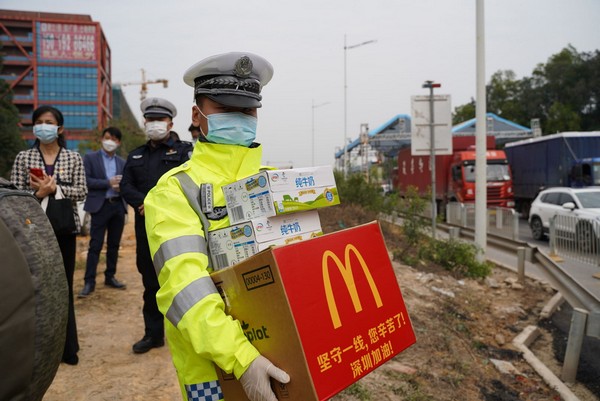 你們?cè)谝痪€戰(zhàn)疫,我們來為你補(bǔ)給!隨后,市關(guān)愛辦攜手伊利集團(tuán)、麥當(dāng)勞先后前往光明羌下公安檢查站、寶安區(qū)松安防疫檢查點(diǎn),為正在一線忙碌的工作人員,送上愛心牛奶與熱乎乎的愛心午餐?!澳銈冃量嗔恕?、“繼續(xù)加油”……每發(fā)放一次牛奶與午餐,工作人員都不忘了戰(zhàn)疫者們致敬致謝。