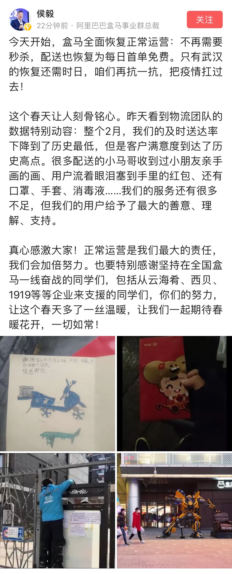 盒馬總裁侯毅在其社交平臺(tái)賬號(hào)上表示,盒馬全面恢復(fù)正常運(yùn)營(yíng)了,用戶也可以告別秒殺了,“疫情期間,正常運(yùn)營(yíng)是我們最大的責(zé)任,我們會(huì)加倍努力。武漢的恢復(fù)還需要一些時(shí)間,大家一起再抗一抗,把疫情扛過去?!?/p>