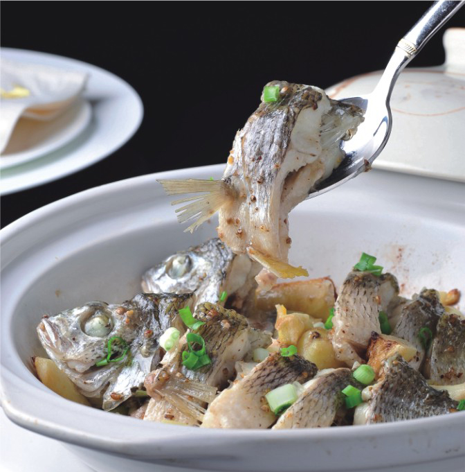 廣東人也會(huì)把立魚(yú)叫做“黃腳立”,立魚(yú)生長(zhǎng)很慢,脂肪含量低,絲毫不見(jiàn)肥膩,最討女仔喜歡。立魚(yú)如果清蒸,則肉質(zhì)偏韌;雷大廚改以鹽焗,用砂鍋爆香姜蔥蒜,魚(yú)肉先經(jīng)鹽、糖、少許油、生粉和胡椒粒撈一撈,下鍋后蓋蓋子焗上五分鐘,入味后經(jīng)砂鍋一焗,緊緊鎖住肉汁。
