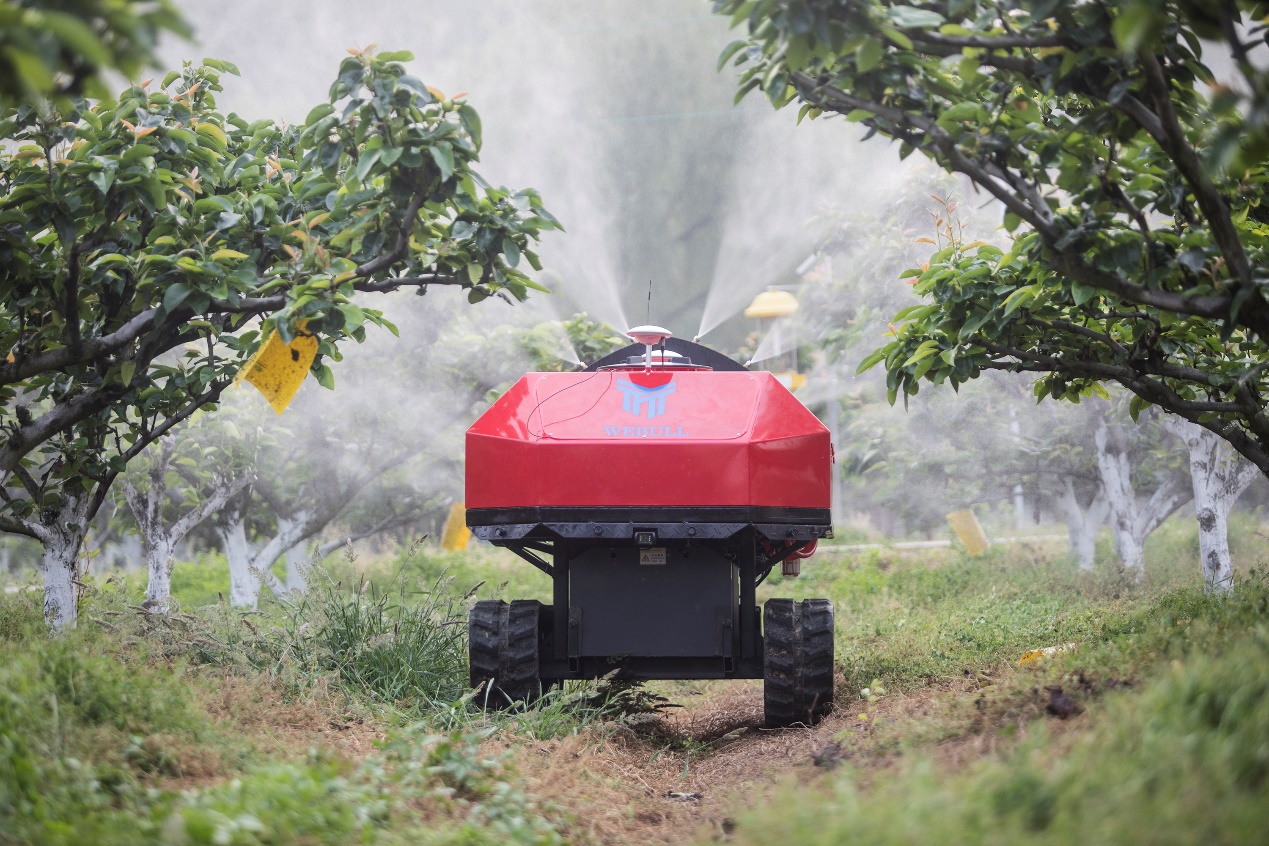 (翠冠梨數(shù)字農(nóng)業(yè)基地的無(wú)人值守果園機(jī)器人正在田間施藥,農(nóng)民可遠(yuǎn)程操控)