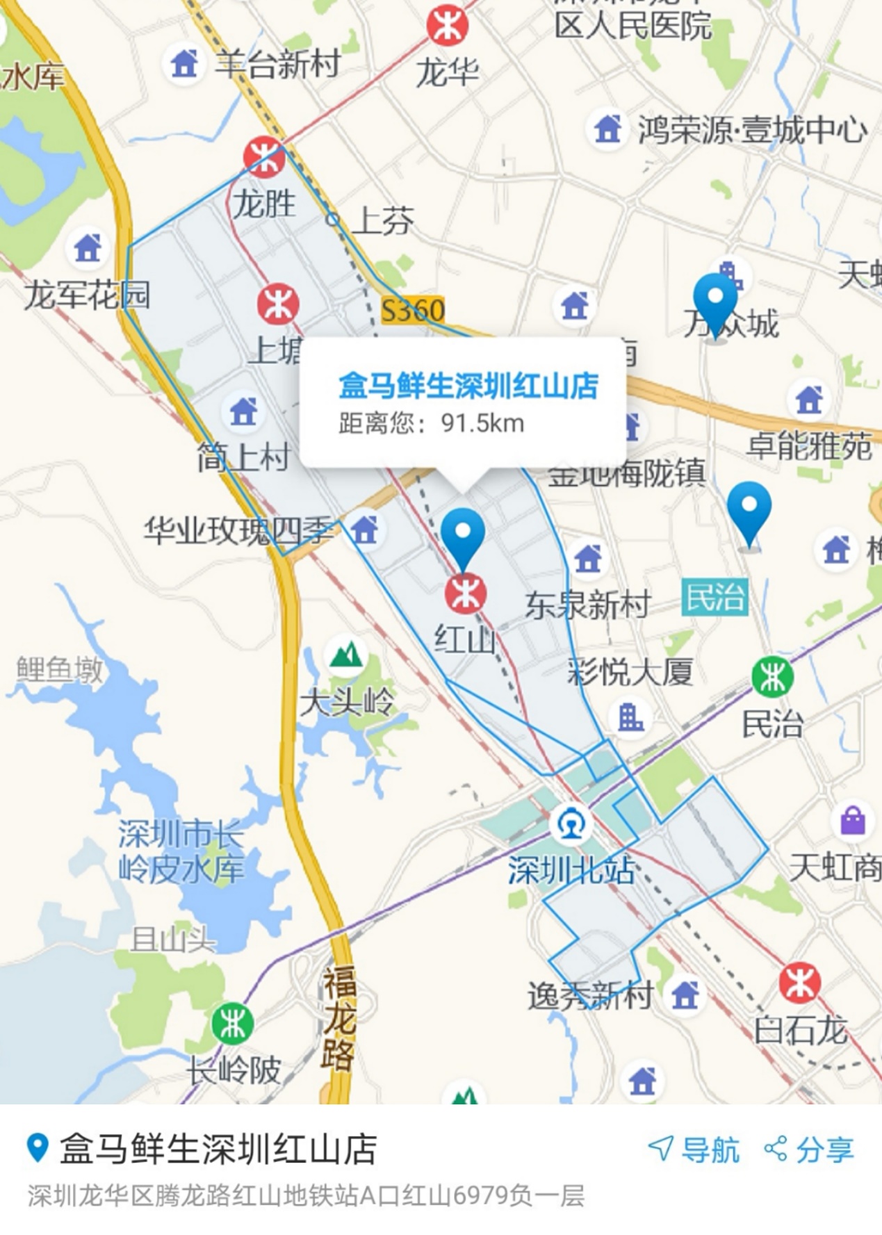 盒馬紅山店的“盒區(qū)房”覆蓋廣深港高鐵沿線,北至龍華區(qū)和平路,南至民豐路,橫跨三個地鐵站,而深圳最大的高鐵站深圳北站(外廣場)也在盒區(qū)范圍內(nèi)。大數(shù)據(jù)中心監(jiān)測,深圳北站商圈內(nèi)居住人口達(dá)到了30.8萬人,工作日客流約75.77萬人。