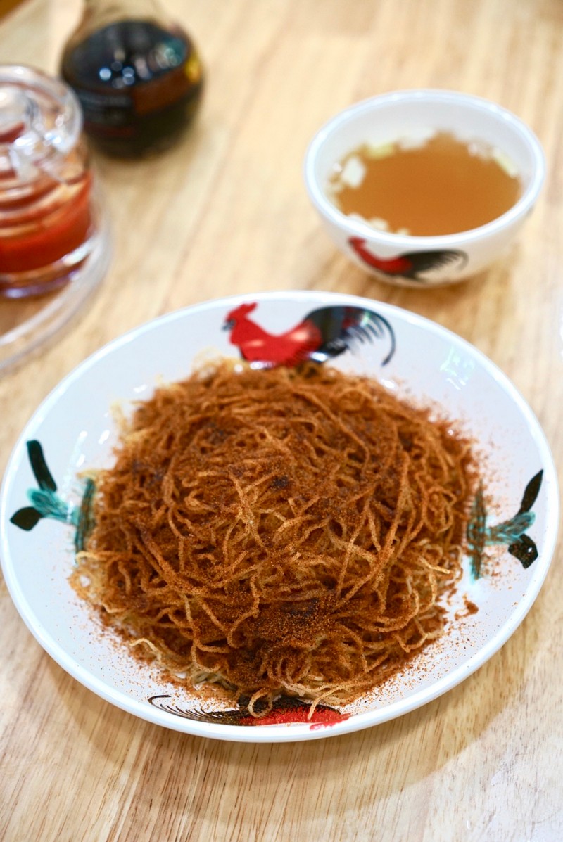 他家的云吞面同樣投注了許多的心機。湯底用厚身的油地、淡水蝦子、蝦米、金華火腿和豬骨來熬制,每天早上3點半開始煲,足足煲上3個小時。他認為如今的雞蛋香味并不遜色于鴨蛋,因此在做面時,他用的是雞蛋,蛋清與蛋黃都用上。蛋清增加面的硬度,蛋黃帶來香度。面條同樣用高筋面,面所用的堿水,是有著上百年歷史的陳村食用堿水,爽中帶麥香,這是嚴格把控走堿時間的“成果”。至于云吞,吳錦云有自己的理解,不加鮮蝦,只用豬的上胛肉。手工處理,挑除上胛肉的筋與網(wǎng)油,最后的成率只有六七成。豬肉全部經(jīng)過手工切,一粒粒肥瘦均勻。薄薄的云吞皮,裹著精制過的豬肉,小巧玲瓏,肉香皮薄。