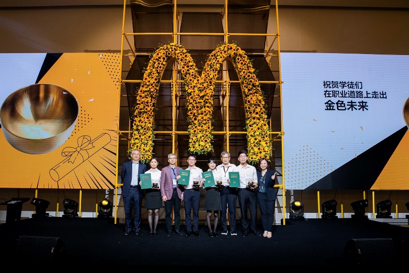 麥當(dāng)勞領(lǐng)導(dǎo)們、陳李翔和陳宇向四位首批畢業(yè)生代表贈(zèng)送“出師證”和金碗,并向未來學(xué)徒發(fā)出邀請