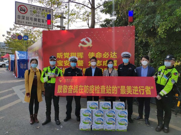 在深圳,2020年2月伊利攜手深圳市關(guān)愛辦及深圳新聞網(wǎng)發(fā)起“致敬‘最美逆行者’”活動,向深圳戰(zhàn)疫一線的民警、交警、醫(yī)務(wù)工作者、義工等進行慰問和捐贈,先后前往光明區(qū)光明交警大隊、光明羌下公安檢查站、寶安區(qū)松安防疫檢查點,為戰(zhàn)疫在一線的工作人員送上愛心牛奶與溫暖午餐。