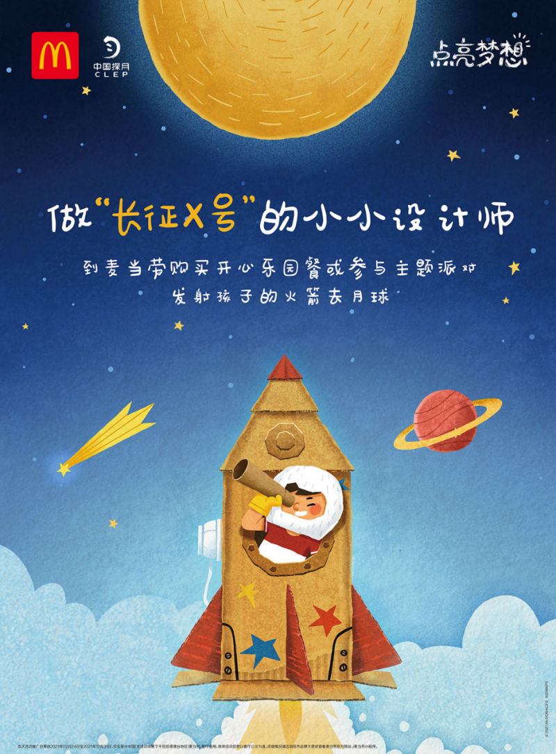 2021點亮夢想活動,是麥當勞與中國探月的二度合作,雙方再次聯(lián)合守護夢想,并鼓勵動手實踐,做到“敢夢敢想敢為”。
