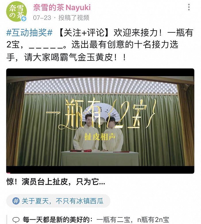 在此之前,奈雪曾用“說相聲”的方式推霸氣金玉黃皮,讓茶飲和相聲組CP;霸氣生椰斑斕上架時,他們出了個東南亞風滿滿的視頻,仿佛一秒到了泰國,創(chuàng)意有趣的同時,也讓消費者對產(chǎn)品留下深刻印象。