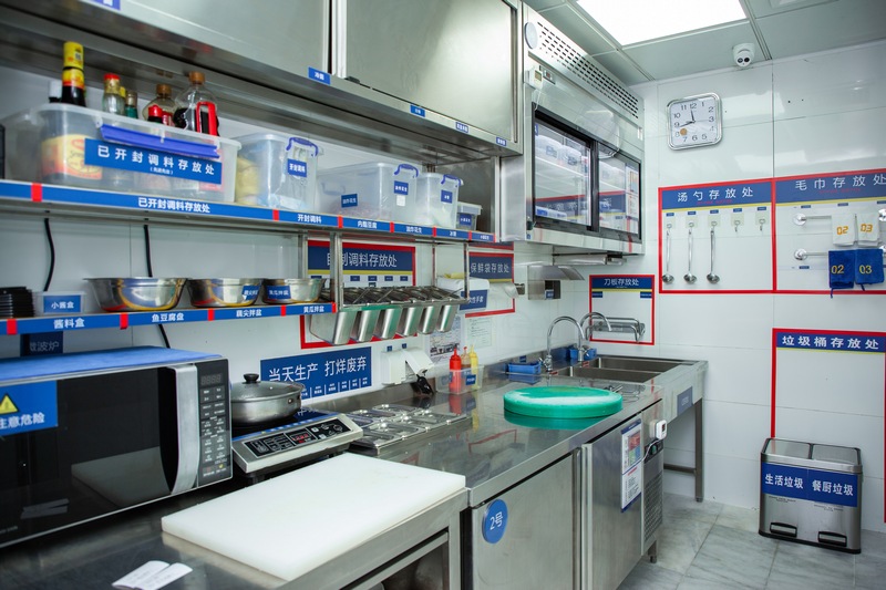 “右手邊是冷菜間,因?yàn)槭嘲惨蟾?,我們都有?zhuān)門(mén)的‘二次更衣室’,在這里更換衣服后,再進(jìn)入對(duì)涼菜進(jìn)行處理?!必?fù)責(zé)人表示,在專(zhuān)門(mén)的涼菜區(qū)里,則可以看到櫥窗中整齊地貼上了諸如“A1圣女果”“B04魚(yú)豆腐”之類(lèi)的標(biāo)簽,同時(shí)備注“當(dāng)天生產(chǎn)打烊廢棄”和“加工日期與廢棄日期”等具體操作指示。“每晚打烊后,我們也會(huì)用紫外線燈對(duì)冷菜間進(jìn)行半個(gè)小時(shí)的消毒?!必?fù)責(zé)人補(bǔ)充。