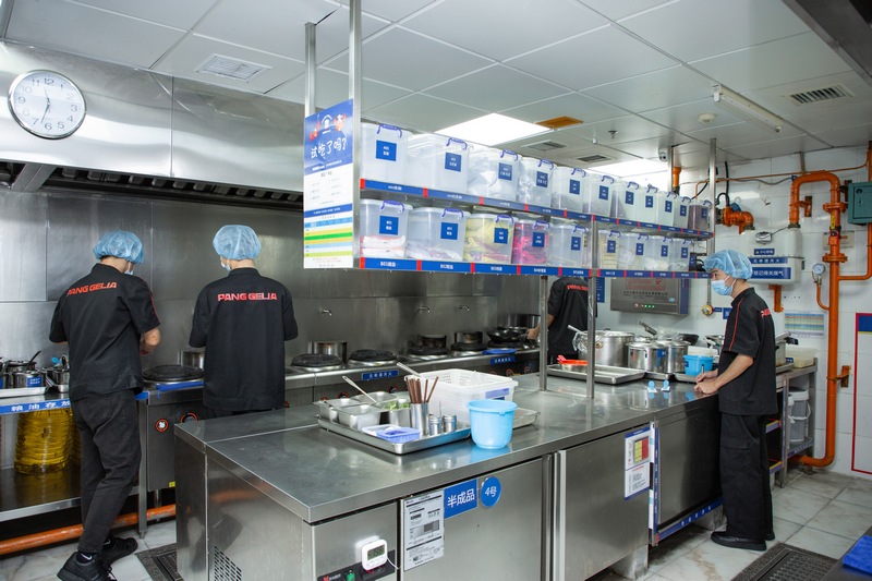 當(dāng)天,走進(jìn)胖哥倆肉蟹煲的門(mén)店,門(mén)口的大屏幕上用四個(gè)角度播放著后廚的監(jiān)控錄像。在進(jìn)入后廚前,媒體和粉絲們帶好口罩、戴上帽子,用消毒液給雙手進(jìn)行消毒,分批進(jìn)入后廚進(jìn)行參觀。