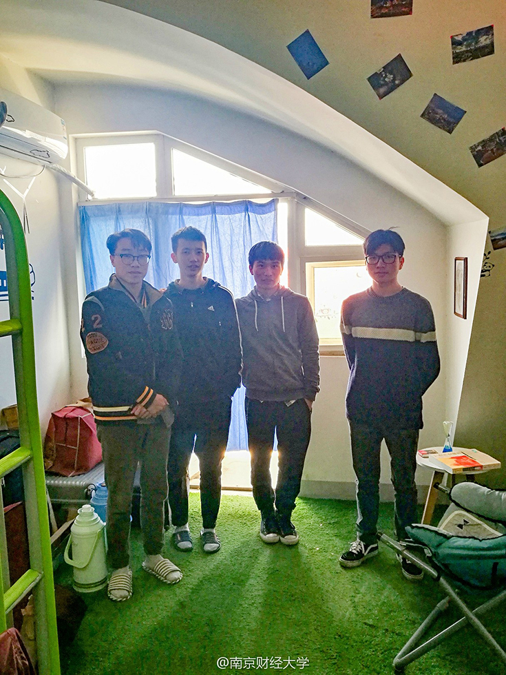 綿綿的草坪、充滿設(shè)計(jì)感的書架、掛著素描畫的墻……難以想象這是四個(gè)19歲男生的寢室。南京財(cái)經(jīng)大學(xué)西苑9幢男生宿舍頂樓602寢室,住著4位“世外高人”—— 涂貴平、柯毅、劉以康和廉鎮(zhèn)宇,他們用事實(shí)告訴大家,男生宿舍文藝起來,可絲毫不輸女生。圖/@南京財(cái)經(jīng)大學(xué)