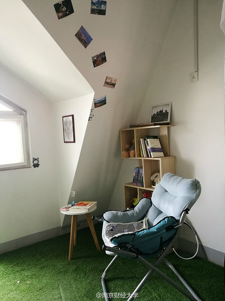 綿綿的草坪、充滿設(shè)計感的書架、掛著素描畫的墻……難以想象這是四個19歲男生的寢室。南京財經(jīng)大學(xué)西苑9幢男生宿舍頂樓602寢室,住著4位“世外高人”—— 涂貴平、柯毅、劉以康和廉鎮(zhèn)宇,他們用事實告訴大家,男生宿舍文藝起來,可絲毫不輸女生。