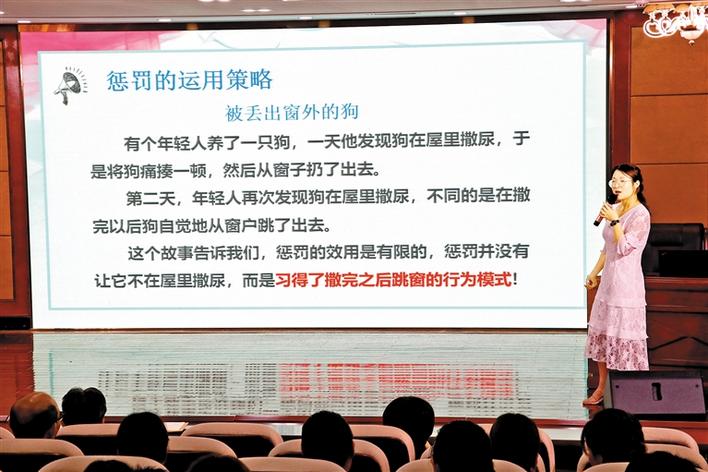 講座中,齊玲老師介紹三體腦精神,然后圍繞“馬斯洛需求層次理論”五個(gè)板塊結(jié)合實(shí)例進(jìn)行具體講解:一、生理需求;二、安全需要,根據(jù)羅森塔爾效應(yīng),指出教師應(yīng)以積極發(fā)展的眼光看待孩子;三、社交需要;四、尊重的需要,從內(nèi)部認(rèn)可的鼓勵(lì)到外部認(rèn)可的鼓勵(lì)會(huì)導(dǎo)致“德西效應(yīng)”;五、自我實(shí)現(xiàn)需求。期間,她通過各項(xiàng)案例,以常見的心理問題為例,層層推進(jìn),逐步告訴老師們面對(duì)此類問題的解決辦法,令老師們受益匪淺。