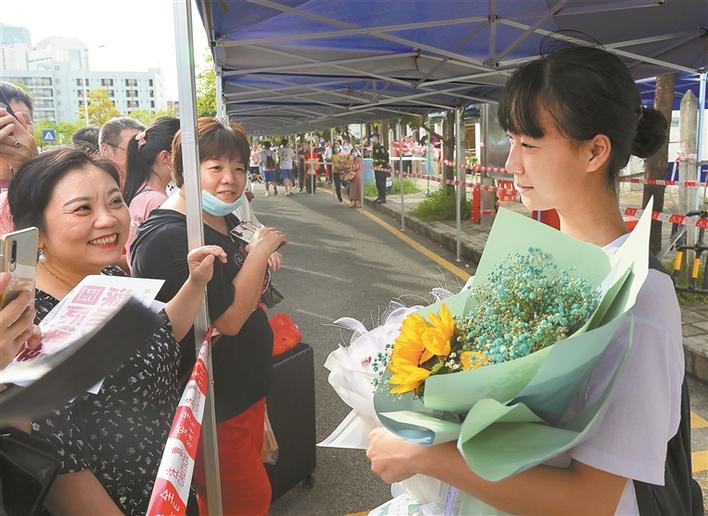 家長(zhǎng)帶著鮮花來(lái)到寶安中學(xué)考場(chǎng)門口迎接考生。深圳商報(bào)記者陳錫明攝