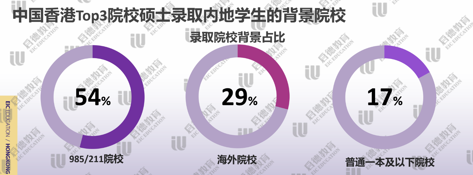 申請香港高校提交雅思成績較多,啟德留學2021客戶服務數據顯示,近3成錄取學生雅思成績達到7分或以上,主要集中在金融、會計、傳媒、英語教育等熱門專業(yè);雅思達到6.5分占比幾乎一半,代表了香港高校錄取學生的平均水平;雅思6分占比不到四分之一,主要分布于理工科或冷門專業(yè)。香港TOP3名校(香港大學、香港科技大學、香港中文大學)錄取的碩士學生中,985/211院校背景的學生超過了一半;因疫情因素導致海外留學生的回流,近30%的碩士學生來自于海外院校本科;雙非院校的占比僅為17%,集中于需要豐富實習和工作經驗的理工科。擁有實習/科研等經歷占比為99%,其中,超八成學生完成了3次以上的實習/科研。