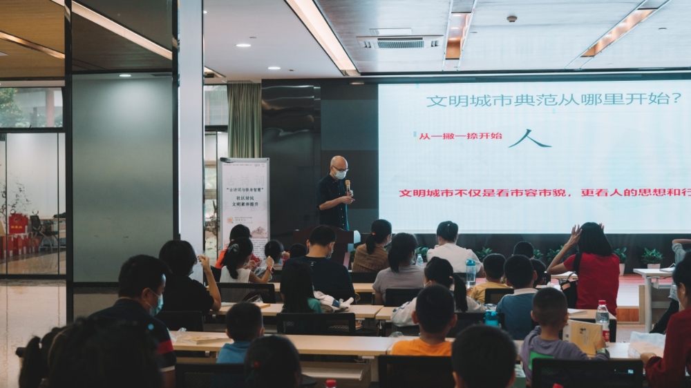 10月31日下午,“‘古詩詞與修身智慧’社區(qū)居民文明素養(yǎng)提升”活動(dòng)在福光社區(qū)黨群活動(dòng)中心多功能室舉行,活動(dòng)吸引了60余名家長(zhǎng)及小孩參與。