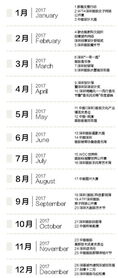 文化是一座城市的魅力與靈魂。必須承認,盡管深圳這座城市文化發(fā)展取得了很大進步,但同時也應該看到,與建成現(xiàn)代化國際化創(chuàng)新型城市的要求、市民日益增長的精神文化需求以及國內(nèi)外先進城市相比,還存在不少薄弱環(huán)節(jié),其中一大短板就是國際化、標志性的品牌文化活動還不多。比如,倫敦大型常設性文化節(jié)慶活動多達200個,香港有近50個,北京、上海也有20多個,而深圳大概在10個左右,有國際影響的屈指可數(shù),部分領域只有一些零散活動,不成體系?;诖?,早在研究制定《深圳文化創(chuàng)新發(fā)展2020(實施方案)》的過程中,深圳創(chuàng)新提出建立“城市文化菜單”。從一定意義上說,建立“城市文化菜單”,是城市定位所需,是文化發(fā)展所需,也是市民生活所需,其重點是通過“菜單”的建立,引進和培育一批新的國際化、標志性的品牌活動,在活動數(shù)量和質(zhì)量上進行“雙提升”。