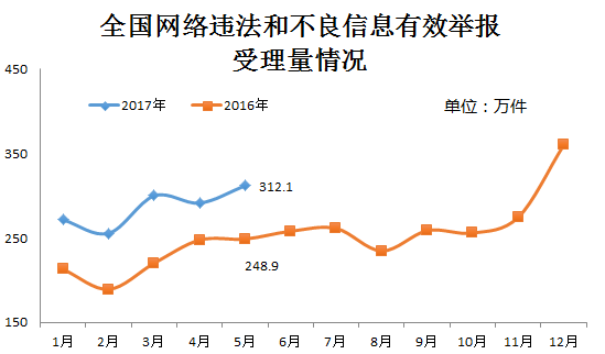 5月份,各地網(wǎng)信辦各網(wǎng)站深入貫徹落實(shí)2017年全國網(wǎng)絡(luò)舉報工作會議暨第三批百家網(wǎng)站公布舉報受理方式會議精神,同時在“六一”國際兒童節(jié)到來前,進(jìn)一步加大對網(wǎng)上違法和不良信息,特別是淫穢色情等嚴(yán)重危害青少年身心健康有害信息的處置力度,受理違法和不良信息有效舉報312.1萬件,環(huán)比、同比分別增長約7.1%和25.4%。