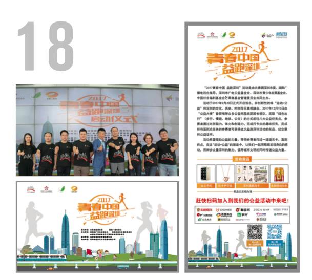由深圳市廣電公益基金會、深圳市青少年發(fā)展基金會等主辦,深圳棠果影視傳媒有限公司承辦。“2017青春中國益跑深圳”活動作為創(chuàng)意公益募捐慈善活動,通過招募深圳市民自愿以“綠色出行”(步行、慢跑、地鐵、公交)的方式完成城市穿越,從而為10個社會慈善項目進行募捐的大型公益活動。