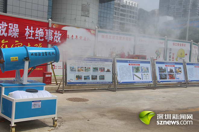 施工單位還在圍擋四周、豎井入口、基坑周邊、隧道掌子面等施工區(qū)域設(shè)置全方位的水幕降塵系統(tǒng),可有效控制和治理地面及空中揚(yáng)塵,改善工地周邊空氣質(zhì)量。此外,該工地采用高強(qiáng)噴霧機(jī),利用不同形狀和霧化角度的噴嘴將水霧化,與粉塵凝聚沉積下來(lái),達(dá)到消除粉塵、凈化空氣的效果。