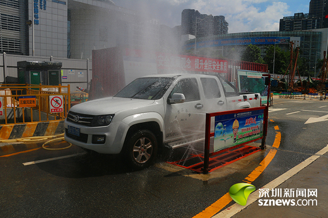 施工單位還利用潛水泵加壓給水管對(duì)車輛進(jìn)行自動(dòng)沖洗,讓施工車輛“清爽出門”,有效防止施工車輛對(duì)城市環(huán)境的污染。同時(shí),沖洗后的污水經(jīng)排水溝回流到三級(jí)沉淀池內(nèi),經(jīng)過沉淀處理后進(jìn)入清水池,使水資源循環(huán)利用,從而達(dá)到保護(hù)環(huán)境又節(jié)約成本的目的。