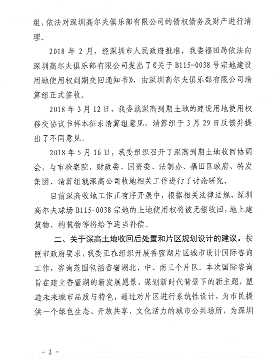 2018年2月,經(jīng)深圳市人民政府批準(zhǔn),深圳市規(guī)土委依法向深圳高爾夫俱樂部有限公司發(fā)出了《關(guān)于B0015-0038宗地建設(shè)用地使用權(quán)到期交回通知書》,由深圳高爾夫俱樂部有限公司清算組正式簽收。
