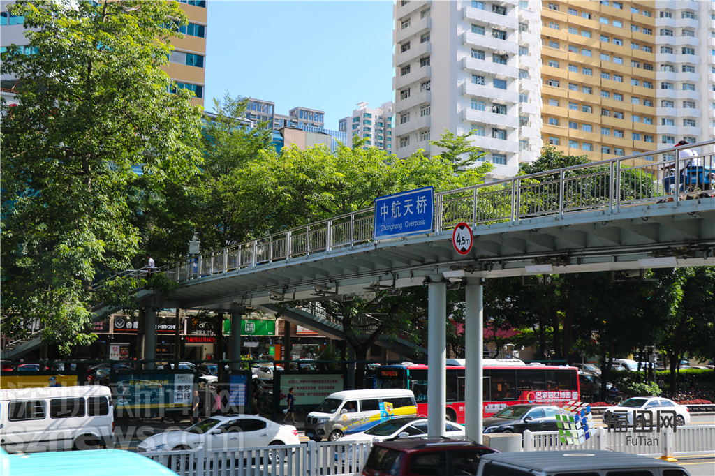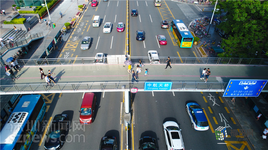 中航天橋位于深南大道上,是華強(qiáng)北過了中心公園后唯一一個(gè)比較標(biāo)志性的構(gòu)筑物