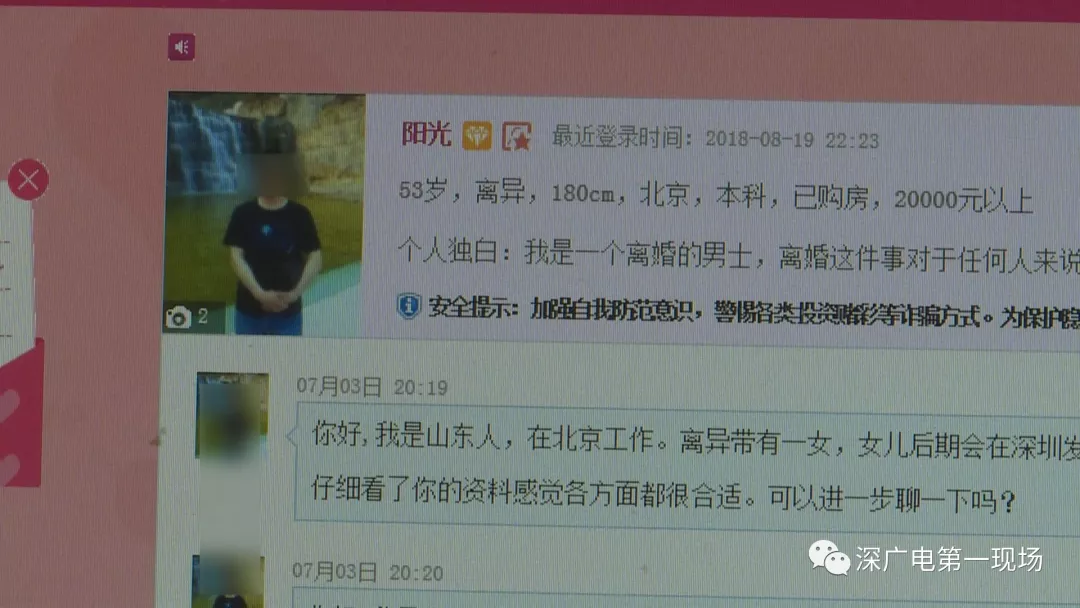 張女士說(shuō),她在三年前離了婚,如今兒子已經(jīng)大學(xué)畢業(yè),想著為自己的下半生找個(gè)依靠,于是張女士便在世紀(jì)佳緣網(wǎng)站花了三百多元注冊(cè)了會(huì)員。7月初世紀(jì)佳緣網(wǎng)站上一個(gè)名叫“陽(yáng)光”的北京網(wǎng)友聯(lián)系了她。