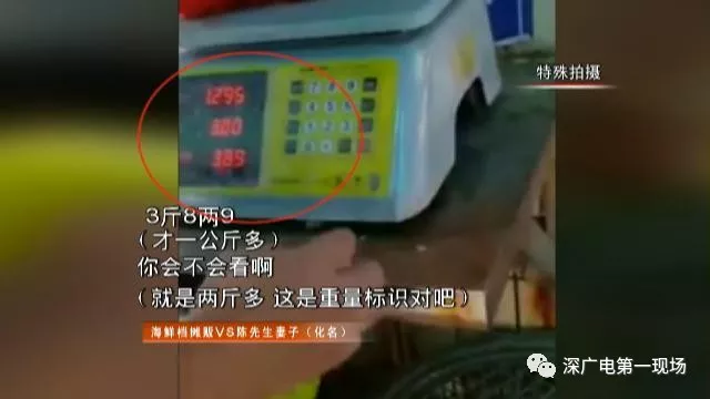 陳先生表示,實際上,剛剛拿去公平稱上的龍蝦只有1.29公斤左右,大約2斤6兩,和這位海鮮檔攤販所說的3斤8兩,差了一斤多。
