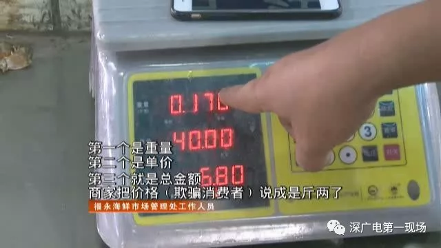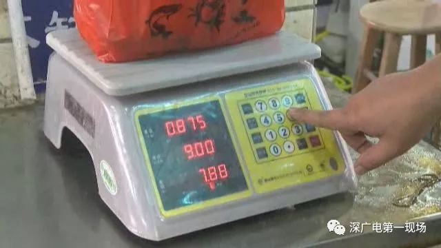 第二天中午,記者以消費者的身份,陪同陳先生夫妻倆,再次來到福永海鮮市場,購買海鮮的海鮮檔,商家介紹,這都是新鮮澳洲龍蝦,價格實惠,童叟無欺。這位海鮮檔攤販熱情的給記者挑選了一只澳洲龍蝦,放在自己攤檔的電子秤上稱重,加上塑料袋,大概是3斤8兩,這時陳先生妻子要求,海鮮檔老板到市場公平秤上進行稱重。