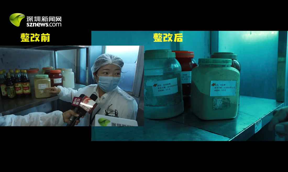 29日突查發(fā)現(xiàn),調(diào)配間調(diào)料打開后未貼標簽。今日深圳新聞網(wǎng)回訪發(fā)現(xiàn),現(xiàn)已加貼完整標簽,包括品名、進貨日期和有效期等信息。