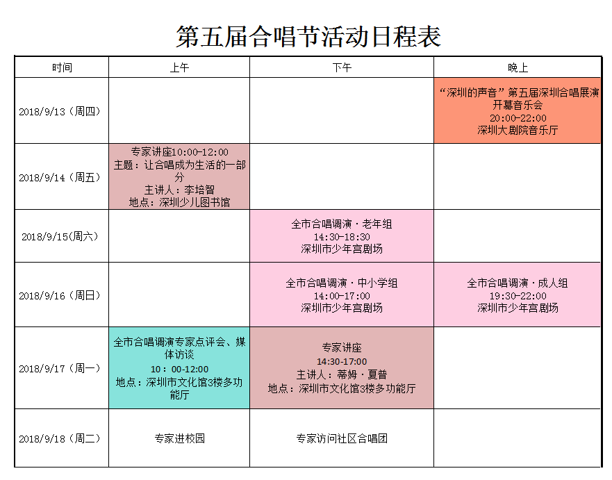 為了充分展示深圳合唱發(fā)展成果,搭建中外、國內(nèi)合唱藝術(shù)交流平臺,本屆合唱展演期間,共安排有深圳合唱調(diào)演(評選)、合唱專場音樂會、合唱公益慰問演出、合唱交流系列活動(合唱指揮大師班或?qū)<抑v座、專家點評會等)、原創(chuàng)合唱歌曲作品征集和評選5個板塊。