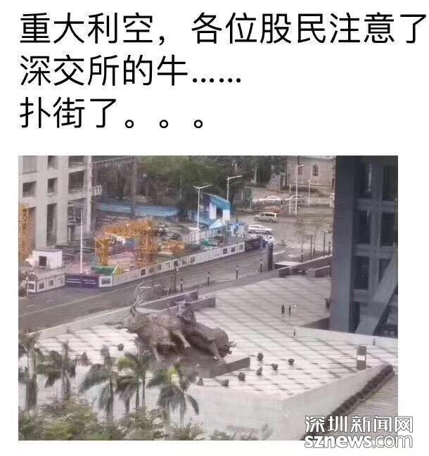 深圳新聞網(wǎng)9月18日訊(記者 張玲 實習生歐陽子瑜 張林羽 陸宇)關于“山竹”的各種段子特別多,博君一笑,未必是真。記者18日發(fā)現(xiàn),有一張像素極低的圖在網(wǎng)上流傳,照片中一頭牛雕塑臥倒在地,配文是:重大利空,各位股民注意了,深交所的牛,撲街了……