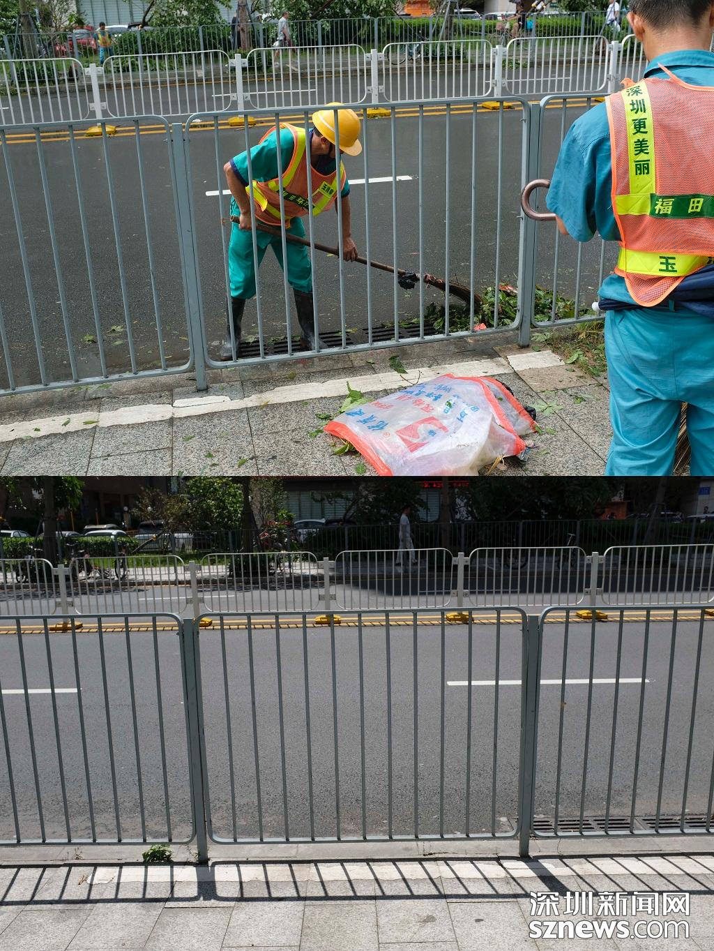 石夏地鐵站E出口清理前后對(duì)比(上圖:2018年9月17日,臺(tái)風(fēng)過(guò)后,環(huán)衛(wèi)工人正在清掃落葉。下圖2018年9月18日早上,路面已經(jīng)清掃完畢,變得更整潔)