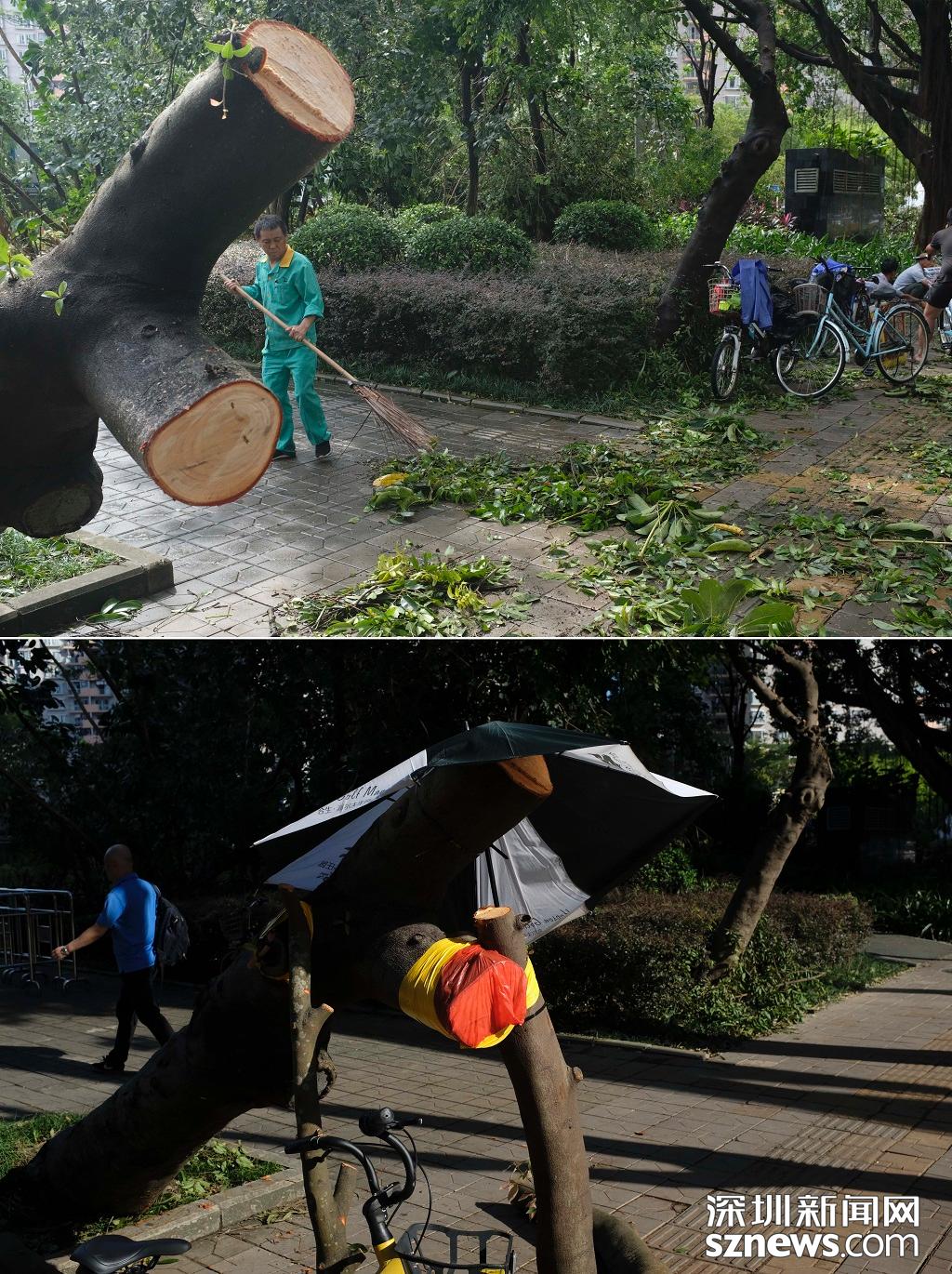蓮花西地鐵站A出口前后對比圖(上圖:2018年9月17日,臺風過后,路面一片狼藉,環(huán)衛(wèi)工人正在清掃。下圖 2018年9月18日下午五點,路面清掃完畢,恢復整潔)