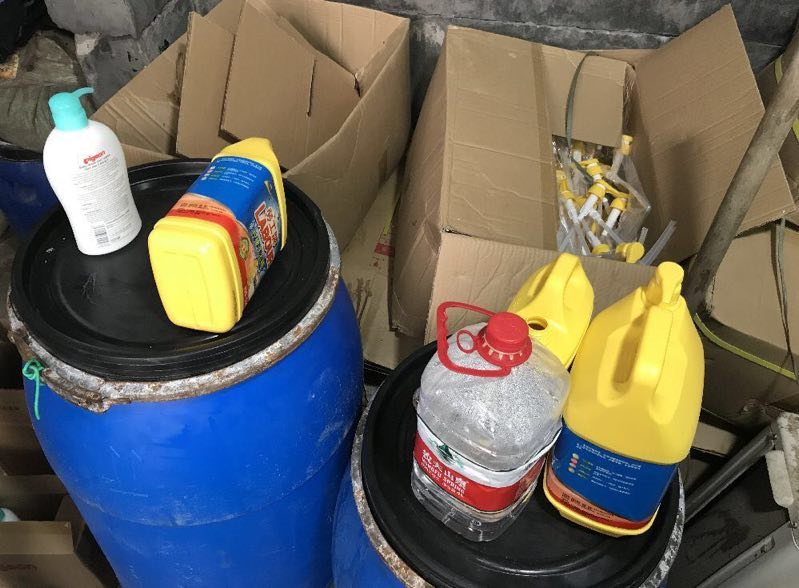 經(jīng)過(guò)執(zhí)法人員檢查,發(fā)現(xiàn)現(xiàn)場(chǎng)有疑似用來(lái)制作洗潔精、消毒液等的原料和工具,現(xiàn)場(chǎng)一些箱子中還有未灌裝的空罐子以及一些待貼標(biāo)簽。據(jù)了解,當(dāng)事人從外面以低廉價(jià)格買來(lái)比較劣質(zhì)、不知名的原料,通過(guò)簡(jiǎn)單勾兌,再分裝成知名品牌日化用品。