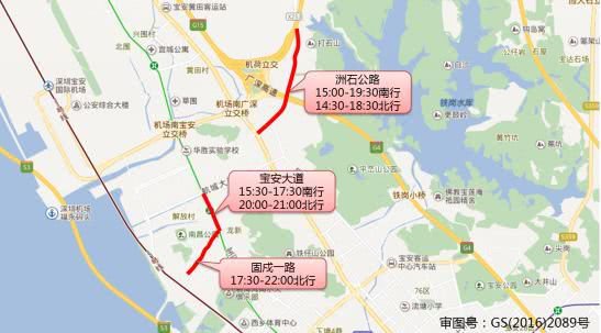 洲石公路(15:00-19:30南行,14:30-18:30北行),寶安大道(15:30-17:30南行,20:00-21:00北行),固戍一路(17:30-22:00北行)。