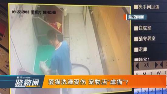 調(diào)取監(jiān)控后發(fā)現(xiàn),當(dāng)時給貓吹毛的工作人員動作粗暴,在貓只抗拒躲閃的時候,有拖拽的動作,期間還把貓騰空甩起頭撞到墻上。