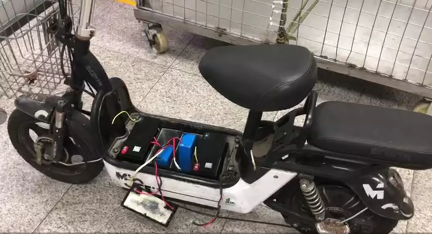 “當(dāng)時看到這名旅客電單車的腳踏板位置比車身其他位置要干凈一些、新一些,就進行了檢查。檢查發(fā)現(xiàn)腳踏板可以直接掀起來,里面的電池盒外表也比較新,這就不太正常了?!爆F(xiàn)場關(guān)員介紹道。隨后,關(guān)員對電動單車電池盒進行了拆卸。