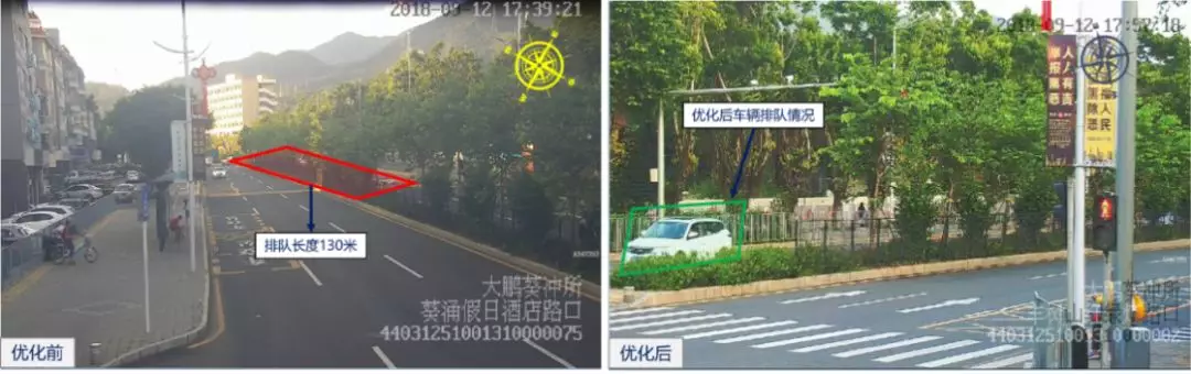 坪葵/豐樹山路口晚高峰時段南進口左轉、掉頭車輛通行需求大,排隊長度可達130米。9月12日,深圳交警對路口17:20至18:30期間的配時方案進行優(yōu)化,增加南直左單放綠燈時間,壓縮南北對放綠燈時間,優(yōu)化后,左轉車輛均可一個周期內清空,排隊長度縮短96%。