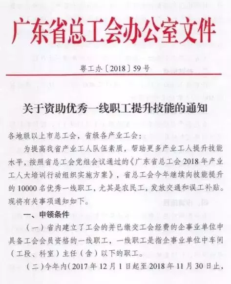 為提高我省產(chǎn)業(yè)工人隊(duì)伍素質(zhì),幫助更多產(chǎn)業(yè)工人提升技能水平,按照省總工會(huì)黨組會(huì)議通過(guò)的《廣東省總工會(huì)2018年產(chǎn)業(yè)工人大培訓(xùn)行動(dòng)組織實(shí)施方案》,省總工會(huì)繼續(xù)向10000名技能提升的優(yōu)秀產(chǎn)業(yè)工人發(fā)放交通和誤工補(bǔ)貼。取得職業(yè)資格證書(shū)可獲300~500元補(bǔ)貼,名額有限,先到先得!