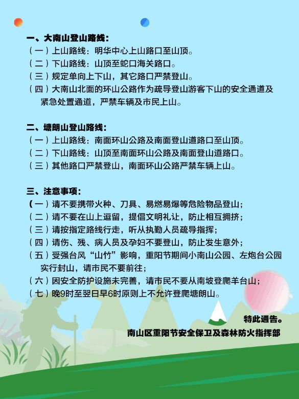 南山區(qū)重陽節(jié)登山通告出爐!小南山左炮臺(tái)重陽封山(附登山路線示意圖)