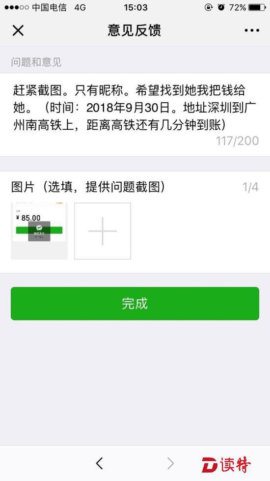 可由于高鐵上網(wǎng)絡(luò)信號(hào)不好,李先生的微信支付一直顯示是"處理中",過(guò)了一分鐘才顯示轉(zhuǎn)帳失敗,而這時(shí),高鐵已經(jīng)到了廣州南站,李先生又下了車(chē),在廣州南站下車(chē)的乘客中找了幾分鐘,但沒(méi)有找到這個(gè)女孩。由于自己也要在廣州南站轉(zhuǎn)車(chē),李先生時(shí)間也很緊,就匆忙上了下一趟去武漢的火車(chē)。