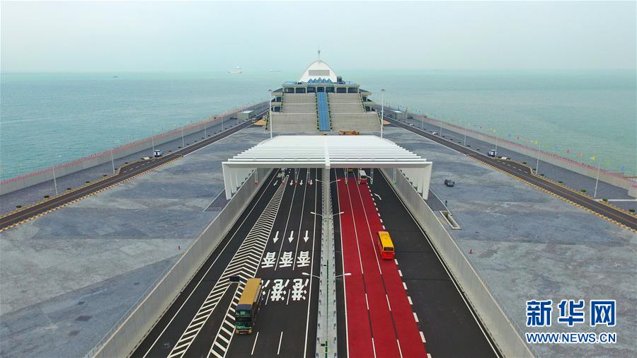 10月24日,來往車輛在東人工島上出入海底隧道(無人機(jī)拍攝)。當(dāng)日,港珠澳大橋正式通車。(新華社記者梁旭攝)