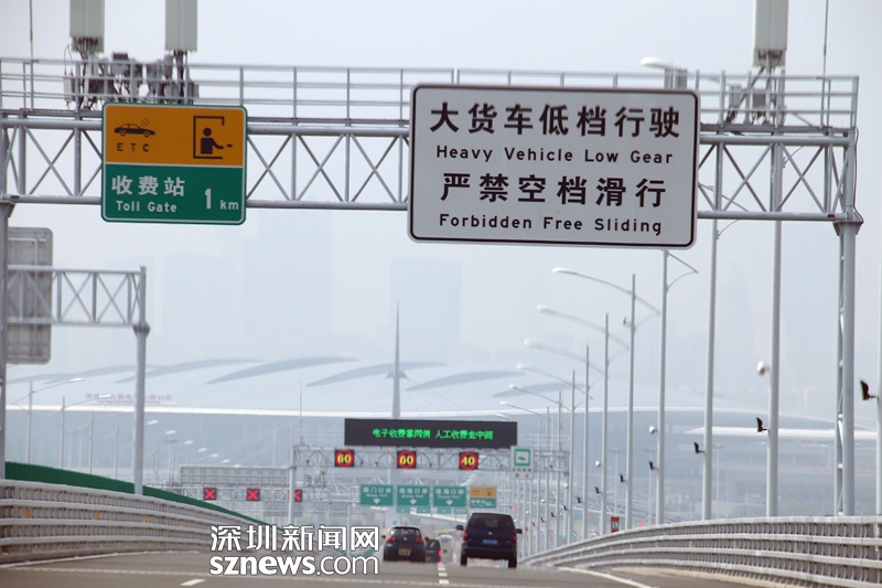 距離珠海收費(fèi)站還有1公里,這里是一段下坡,指示牌提醒嚴(yán)禁空檔滑行