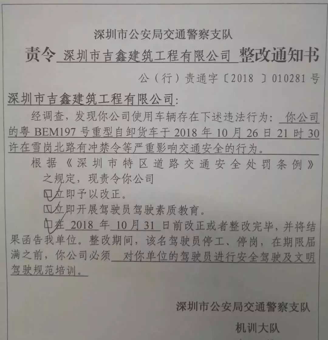 深圳交警依法對(duì)深圳市吉鑫建筑工程有限公司下達(dá)整改通知書(shū),責(zé)令公司進(jìn)行整改: