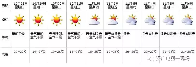 28日到11月1日持續(xù)晴朗干燥,28日氣溫20-27℃;11月2日起云量逐漸增多?;痣U預(yù)警信號將持續(xù)生效,建議做好防火安全管理。