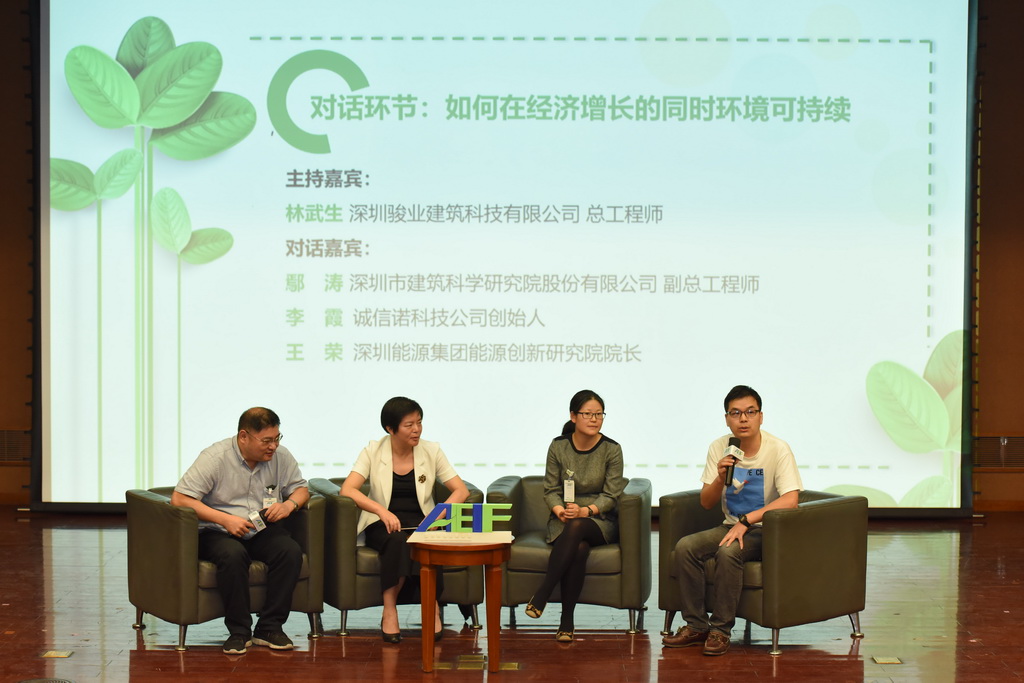 “如何在經(jīng)濟增長的同時環(huán)境可持續(xù)”是10月27日論壇的最后一個對話環(huán)節(jié),由深圳駿業(yè)建筑科技有限公司總工程師林武生擔任嘉賓主持,來自來自深圳能源集團能源創(chuàng)新研究院的王榮院長、深圳市建筑科學研究院股份有限公司副總工程師鄢濤、誠信諾科技公司創(chuàng)始人李霞不僅對競賽單元的4個項目以及之前的嘉賓分享內(nèi)容進行了點評和回顧,在介紹各自所在企業(yè)背景的基礎上,還從綠色建筑和清潔能源發(fā)展的角度進行分析,如何在經(jīng)濟增長的同時堅守環(huán)境底限,不做故作綠色的項目,從戰(zhàn)略到細節(jié)思考和實踐具有持續(xù)性的創(chuàng)新設計。