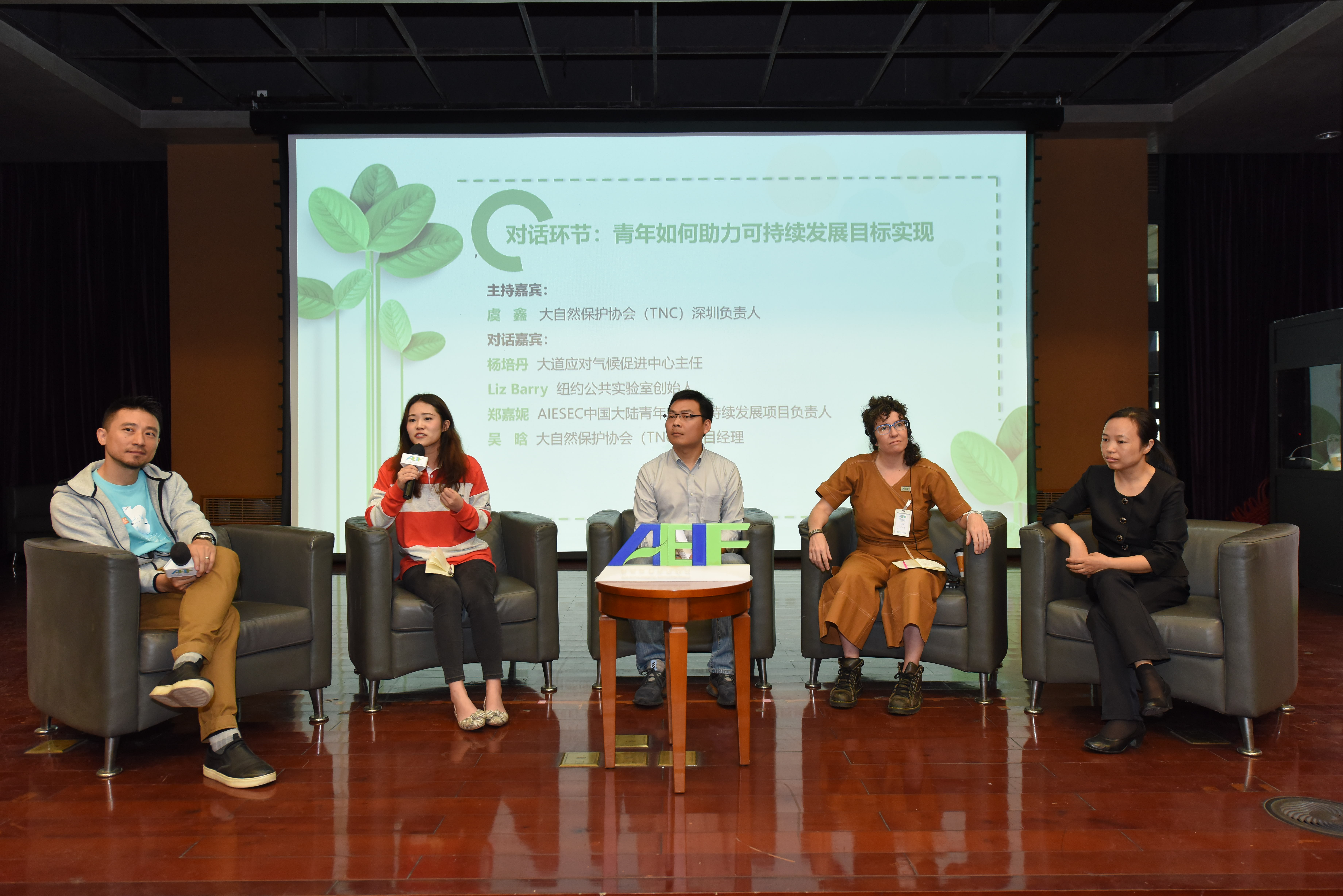 對話環(huán)節(jié)“青年如何助力可持續(xù)發(fā)展目標實現(xiàn)”共有6位嘉賓參與。在主持嘉賓大自然保護協(xié)會(TNC)深圳保護項目負責人虞鑫先生的帶領下,大道應對氣侯促進中心主任楊培丹、紐約公共實驗室創(chuàng)始人Liz Barry、AIESEC中國大陸青年獻力可持續(xù)發(fā)展項目負責人鄭嘉妮、大自然保護協(xié)會(TNC)項目經(jīng)理吳晗參與了分享交流。