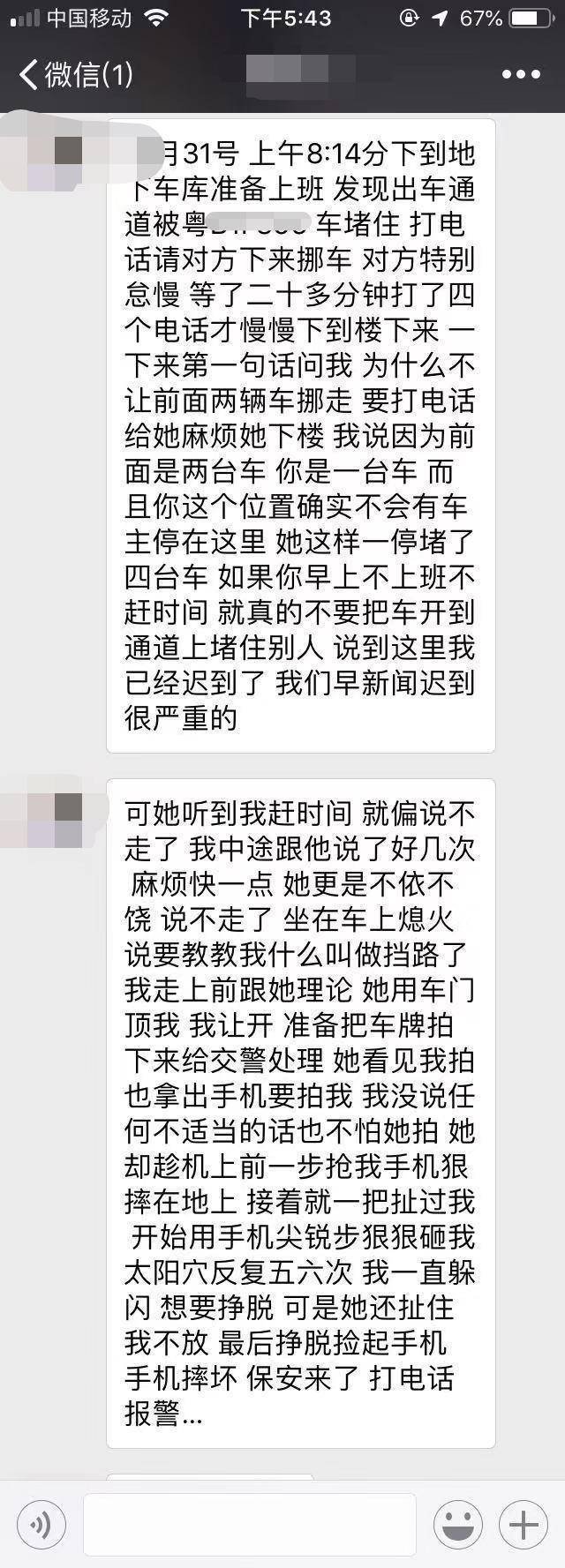 俗話說遠親不如近鄰,但有的時候,同住一棟樓的業(yè)主卻因一點小事而大打出手,鬧得不歡而散。近日,家住南山蛇口的李小姐向記者報料,10月31日早上,因車庫過道被其他車輛阻擋。她打電話請車主下樓挪車,不料手機被對方摔壞了,自己也被打傷了。