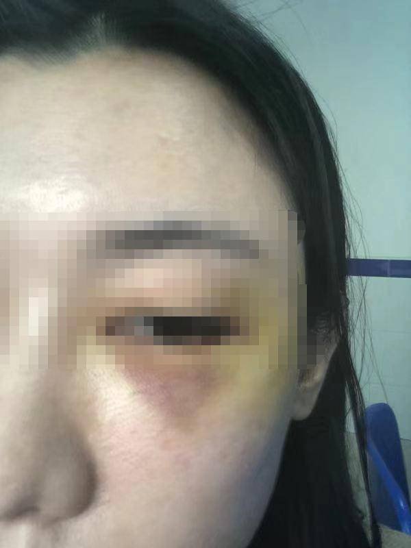 根據(jù)照片顯示,李小姐左眼下有一塊明顯淤青的部位,她表示,這是對方用手機尖銳部反復(fù)砸她臉部所受到的傷。因為臉部受傷,目前她只能暫停工作。