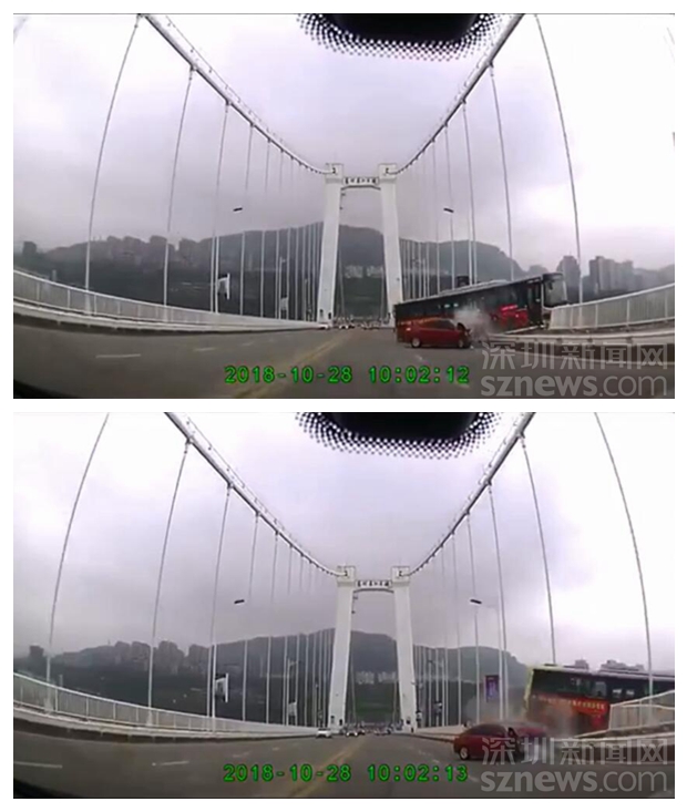重慶22路公交墜江瞬間視頻截圖來(lái)自事發(fā)時(shí)路過(guò)大橋的小汽車(chē)行車(chē)記錄儀